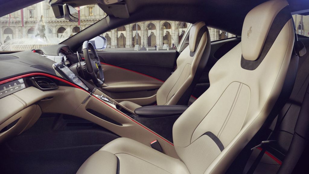 With a name like “Roma” and a front grill reminscient of the 250 GT Lusso, you might assume this car to be a product of old-school design philosophy. However, Ferrari have packed the Roma with intelligent technology and thoughoutfully wrapped it under the elegant exterior. The Roma actually has active aero (something you don’t usually find on a GT car) in the form of a mobile rear spoiler that generates air vortices and provides downforce. Ferrari has even shaped vortex generators at the front of the car to create a ground effect and manage the wake caused by the front wheels. Remember that seamless dual-clutch gearbox I was talking about before? Well that was lifted straight out of the SF90 Stradale and given distinct, longer ratios to provide a perfect marriage between the engine and transmission. When it comes to car configuration, the engine has been pushed as close to the cabin as possible to create a mid-front-engine layout which improves vehicle dyanmics and handling stabilty. Perhaps the most evident represenation of this technology-oriented approach, however, can be found in the interior. It really is quite different than what we are accutsomted to seeing in a Ferrari. Almost everything is digital and even the passenger gets a multi-function display which Ferrari claims is in effort to create, “a more organic distribution of space and functions, so that the passenger feels extremely involved in the driving.” To be honest, I do still feel that the busy steering wheel and dashboard create a somewhat cluttered environment, but the rest of the interior is really rather elegant and implements all this touch-screen technology in a subttle manner. All of this, yet again, adds to the Roma’s core character of balance.